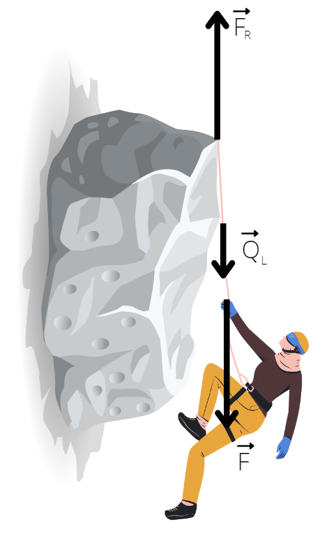 Siły działające na linę to siła ciężkości liny, siła przeciwna do siły napinającej linę pochodzącej od wspinacza i siła reakcji liny od skały.