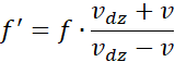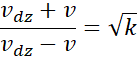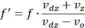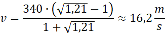 Korzystamy ze wzoru na zjawisko Dopplera, kiedy zarówna źródło, jak i obserwator poruszają, się, ale w przeciwnych kierunkach. Zamiana wysokości dźwięku w naszym przypadku będzie oznaczała przemnożenie częstotliwości przez pierwiastek z tego, ile razy dźwięk się podwyższył. Wykorzystując te zależności, wyprowadzamy wzór na szukaną prędkość.