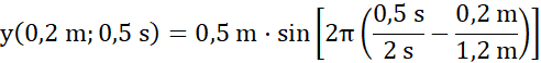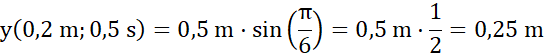 Oblicz wychylenie z położenia równowagi punktu, który znajduje się w odległości x = 0,2 od źródła fali, wiedząc, że fala dotrze do niego po t = 0,5 s, amplituda wynosi A = 0,5 m, okres ma wartość T = 2 s, długość fali to λ = 1,2 m, a przesunięcie fazowe ma wartość