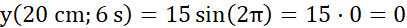 Zauważ, podane w treści wartości pasują do jednostek występujących w równaniu – nie zmieniaj je na jednostki układu SI. Wstaw je do podanego w treści równania i wykonaj konieczne obliczenia. Pamiętaj, sinus 2π jest równy zero, więc cały iloczyn będzie zerem.