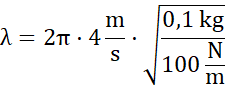 Pamiętaj, długość fali to iloczyn jej prędkości rozchodzenia się i okresu. Z treści zadania wiesz, że częstotliwość (a więc też okres, gdyż jest on odwrotnością częstotliwości) drgań ciężarka wymuszającego drgania liny jest równa częstotliwości drgań własnych wahadła sprężynowego. Przypomnij sobie wzór na okres drgania wahadła sprężynowego z poprzedniego działu – jest to iloczyn 2π oraz pierwiastka ilorazu masy i współczynnika sprężystości sprężyny. Wstaw podane dane do wzoru i wylicz szukaną długość fali.