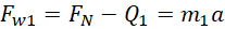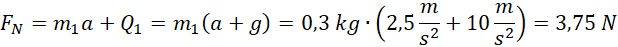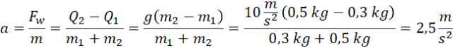 Na początku obliczamy przyspieszenie układu za pomocą drugiej zasady dynamiki. Następnie zapisujemy drugą zasadę dynamiki dla pierwszego ciężarka i wyznaczamy wartość siły napięcia nitki.