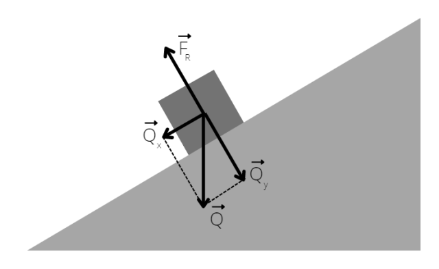Na ciało działa siła ciężkości, którą rzutujemy na kierunki x i y oraz siła reakcji pochodząca od powierzchni równi.