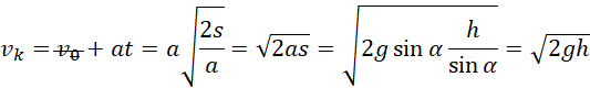 Na początku obliczamy przyspieszenie ciała na kierunku równoległym do równi, korzystając z drugiej zasady dynamiki. Następnie wyznaczamy wartości drogi i czasu korzystając z definicji sinusa oraz ze wzoru na drogę w ruchu jednostajnie przyspieszonym. Na koniec zapisujemy wzór na prędkość końcową w ruchu jednostajnie przyspieszonym i podstawiamy obliczone wcześniej wielkości.