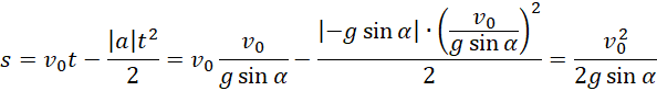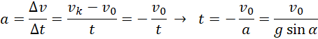 Na początku obliczamy opóźnienie ciała na kierunku równoległym do równi, korzystając z drugiej zasady dynamiki. Następnie wyznaczamy wartość czasu ruchu, korzystając ze wzoru na opóźnienie w ruchu jednostajnie opóźnionym. Na koniec zapisujemy wzór na drogę w ruchu jednostajnie opóźnionym i podstawiamy odpowiednie wielkości.
