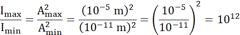 Przypomnij sobie wzór na natężenie fali dźwiękowej z wykorzystaniem amplitudy. Zauważ, natężenie jest wprost proporcjonalne do kwadratu amplitudy (gdy natężenie wzrośnie x razy, amplituda wzrośnie x2 razy). Zapisz odpowiednią proporcję – z jednej strony równości umieść iloraz natężeń, a z drugiej – iloraz kwadratów amplitudy. Wstaw podane dane i wylicz wartość ilorazu. Maksymalne natężenie jest 1012 razy większe od minimalnego natężenia, które ma wartość