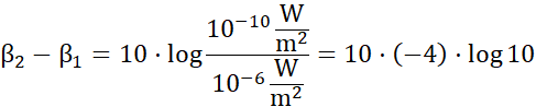 Skorzystaj ze wzoru na poziom natężenia dźwięku (jest to iloczyn liczby 10 i logarytmu dziesiętnego z ilorazu natężenia dźwięku i progu słyszalności). Następnie oblicz różnicę poziomów natężenia, czyli wykonaj odejmowanie. Pamiętaj, różnica logarytmów to logarytm ilorazu. Aby ułatwić sobie liczenie, wyciągnij wykładnik liczby logarytmowanej przed logarytm (logarytm dziesiętny z 10 to 1). Otrzymany wynik jest ujemny, czyli poziom natężenia zmniejszył się, czyli dźwięk stał się cichszy.