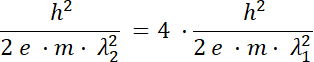Energia kinetyczna protonu zdobyta od napięcia przyspieszającego jest proporcjonalna do tego napięcia. Jeśli napięcie wzrasta czterokrotnie, energia kinetyczna również wzrasta czterokrotnie. Skoro energia kinetyczna jest proporcjonalna do kwadratu pędu, to pęd protonu będzie dwukrotnie większy, co oznacza, że długość fali zmniejszy się dwa razy.