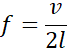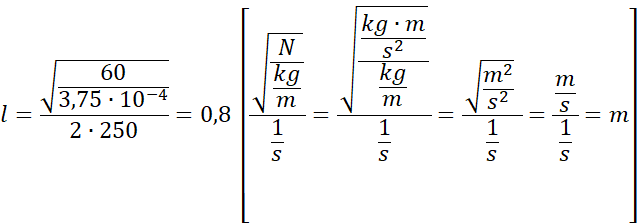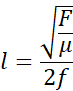Korzystając ze wzoru na częstotliwość oraz pamiętając, że podstawowa długość fali jest równa dwukrotności długości struny, wyprowadzamy wzór na długość struny, gdzie w miejsce prędkości podstawiamy wzór dany w informacji do zadania.