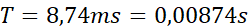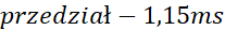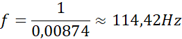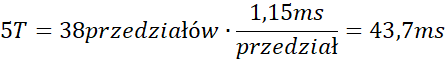Przykładowo z wykresu odczytujemy, że pięciu okresom odpowiada około 38 podziałek, następnie układamy proporcję i obliczamy okres tego drgania, a ze wzoru obliczamy częstotliwość.