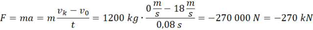 Oblicz wartość średnią siły zgniatającej przód samochodu, jeśli w czasie 0,08 s zatrzymuje się on z prędkości 64,8 km/h. Wiemy, że samochód waży 1,2 tony.