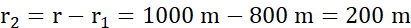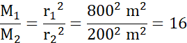 Ciała o różnych masach ustawiono w odległości 1000 metrów od siebie. W odległości 800 metrów od pierwszej masy równoważą się siły przyciągania grawitacyjnego, które działają na umieszczone tam ciało. Policz, jaki jest iloraz mas, kiedy warunek równowagi sil jest spełniony.