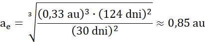 Policz średnią odległość planety Gliese 876 e od jej gwiazdy, znając okres obiegu tej planety oraz okres obiegu i średnią odległość innej planety, która krąży wokół tej gwiazdy.