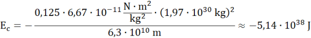 Policz, ile wynosi całkowita energia układu podwójnego gwiazd krążących wokół wspólnego środka masy. Policz, ile energii wydzieliłoby się podczas tworzenia tego układu, gdyby gwiazdy na początku znajdowałyby się w nieskończoności.