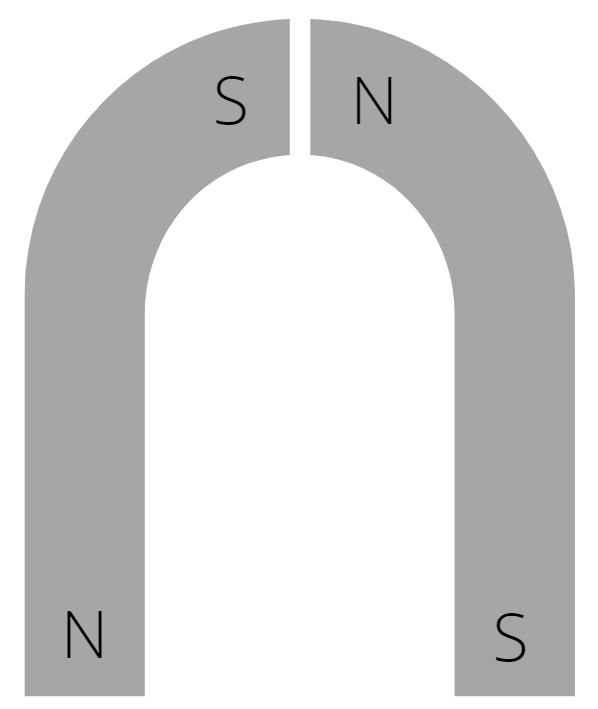 Odpowiedz, gdzie znajdą się bieguny magnesów powstałych przez przecięcie magnesu podkowiastego na granicy kolorów.