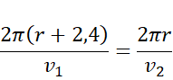 Zapisz wzór na prędkość w ruchu po okręgu jako iloraz obwodu i okresu. Okres obiegu pełnego koła musi być taki sam dla obu gąsienic. Promień zakrętu jest zaznaczony jako odległość do wewnętrznej gąsienicy. Przyrównaj do siebie wzory na okres obiegu. Podstaw informacje o promieniu. Następnie oblicz wartość promienia, pamiętając o zamianie jednostek.