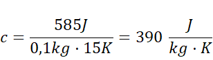Przekształcamy wzór na ciepło potrzebne do ogrzania ciała i podstawiamy do niego dane, tak, aby obliczyć ciepło właściwe.