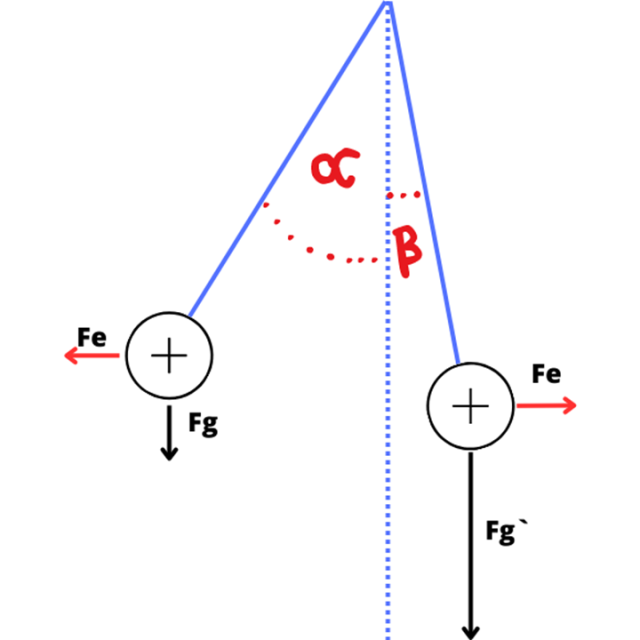 Siła elektryczna jest taka sama dla obu kul, ale wypadkowa siła złożona z prostopadłych do siebie sił odpychania i grawitacji ma różną wartość. Wynika to właśnie z różnicy mas.