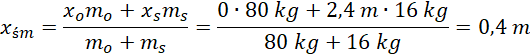 Środek masy znajduje się w odległości 0,4 m od rufy łodzi.