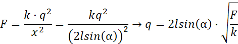 Dwie kulki przyczepiono do końcówek pręta o długości 20 cm, po czym w połowie go zgięto, a kulki naelektryzowano ładunkiem q. Korzystając z danych na wykresie i wzoru na siłę oddziaływania elektrostatycznego (odpychania się kulek) znajdź wartość ładunku, jakim naładowano kulkę.