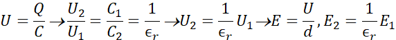 Między okładki kondensatora wsuwa się dielektryk o względnej przenikalności er = 3,7. Określ, jak zmieni się natężenie pola elektrycznego między okładkami kondensatora w przypadku gdy: