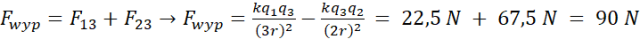 Siła pochodząca od oddziaływania ładunku q3 z q2 i q1 skierowana jest w prawo („odpycha” ładunek q3 od q2 i q1. Zwrot siły wyznaczono zgodnie z konwencją.