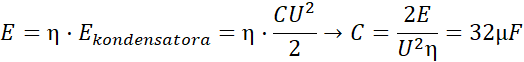 Oblicz pojemność kondensatora w defibrylatorze wiedząc, że 50% energii elektrycznej przez niego gromadzonej przechodzi przez pacjenta.