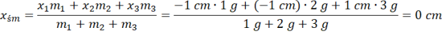 Wykorzystujemy wzór na środek masy układu. Gdy przesunęliśmy układ o 1 cm w prawo, środek masy układu przesunął się o 1 cm w lewo.
