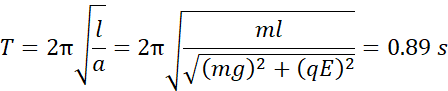 Skoro siła elektrostatyczna i grawitacyjna są do siebie prostopadłe, to aby znaleźć długość wektora będącego ich sumą (czyli długość przekątnej trójkąta utworzonego przez nie), skorzystaj z twierdzenia Pitagorasa. Następnie skorzystaj ze wzoru na wahadło matematyczne. Przyjmij, że w otoczeniu punktu równowagi na ciało działa takie samo przyspieszenie (pozwala to patrzeć na sytuację, tak jakby ciało znajdowało się w nowym polu grawitacyjnym).