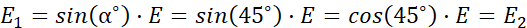 Rozłóżmy pole E na składowe pochodzące od ładunku q1 i q2. Można zauważyć, że wektor E, jest przekątną kwadratu tworzonego przez wektory pola E1 i E2 pochodzące odpowiednio od ładunków q1 i q2. Ich długość to