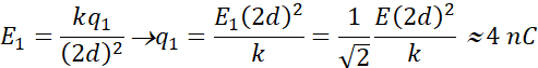 Skorzystano z faktu, że wektor pola E tworzy z poziomem kąt 45°, a następnie przekształcając wzór na natężenie pola elektrycznego, znaleziono ładunek q.