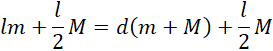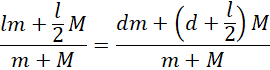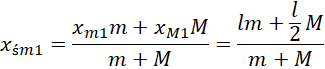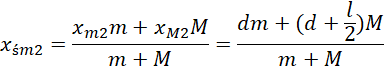 Zapisujemy wzory na środek masy w obu przypadkach, zakładając, że punkt 0 osi x znajduje się w punkcie na lewym końcu platformy w pierwszym przypadku. Mimo innego rozłożenie masy środek masy się nie zmienia, więc zapisujemy tę równość i dzięki niej obliczamy odległość, o jaką przesunęła się platforma.