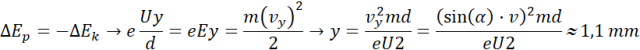 Cząstka b+ wpuszczona została pod kątem 60 stopni w obszar jednorodnego pola elektrycznego o wymiarach 30 mm na 12 mm, gdzie napięcie między płytkami wynosi 600V. Ustal, czy cząstka dotrze do górnej płytki.