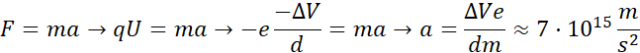 Skorzystano z faktu, że elektron porusza się w jednorodnym polu elektrycznym, przez co wykonuje ruch jednostajnie przyspieszony.