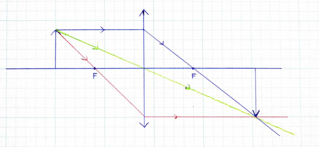 Obraz powstający za soczewką jest obrazem rzeczywistym. Dodatkowo widać, że jest większy od przedmiotu oraz odwrócony (grot strzałki).