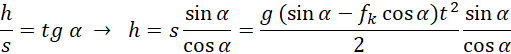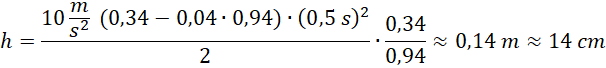 Zapisujemy wzór na siłę wypadkową. Następnie korzystamy z drugiej zasady dynamiki i wzoru na siłę tarcia wyznaczając wartość opóźnienia kostki lodu. Obliczamy drogę przebytą przez kostkę za pomocą wzoru prawdziwego w ruchu jednostajnie przyspieszonym. Następnie obliczamy wysokość, uwzględniając występującą geometrię.