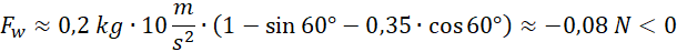 Korzystając z drugiej zasady dynamiki, obliczamy siłę wypadkową. Jest ona mniejsza od zera, co oznacza, że klocek się nie porusza. Następnie zapisujemy I zasadę dynamiki zakładając, że zwrot siły tarcia jest skierowany w dół równi. Otrzymany wynik liczbowy ma wartość dodatnią, więc założenie było poprawne.