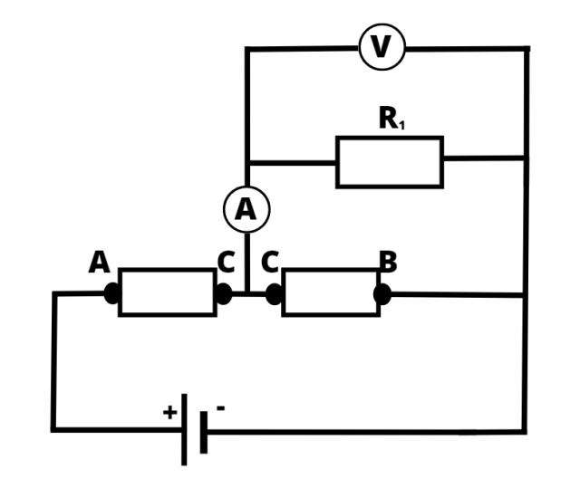 Zauważ, że w tym przypadku potencjometr jest podzielony na 2 mniejsze oporniki: AC (płynie w nim prąd z obu gałęzi), oraz CB (płynie w nim prąd tylko z jednej gałęzi.