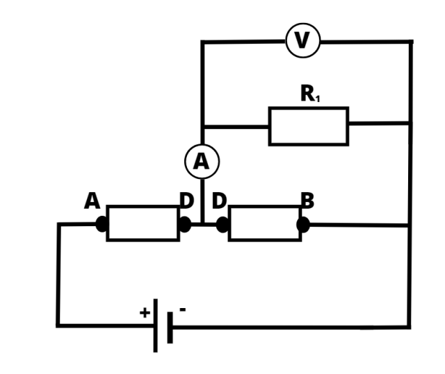 Spójrz na schemat obwodu elektrycznego i ustal, co wskaże amperomierz i woltomierz, kiedy suwak opornika suwakowego znajduje się w punkcie D .