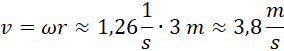 Na początku zamieniamy jednostkę częstotliwości na jednostkę układu SI. Następnie korzystamy ze wzoru na prędkość kątową i prędkość liniową.
