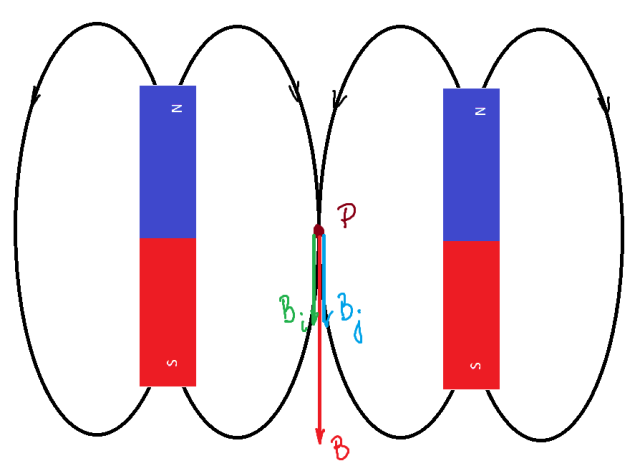 W tym zadaniu należy narysować zwroty linii pola obydwu magnesów oraz skonstruować wypadkowy wektor indukcji magnetycznej w punkcie P.