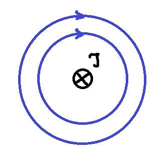 Sytuacja, gdy prąd płynie za płaszczyznę rysunku – zwrot linii pola magnetycznego wyznaczysz, korzystając z reguły prawej dłoni.