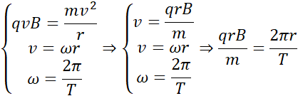 W celu obliczenia okresu obiegu cząstki konstruuję układ równań składający się z równoważności siły dośrodkowej i siły Lorentza, ponieważ w polu magnetycznym to siła Lorentza odpowiada za krzywiznę toru, zatem pełni rolę siły dośrodkowej, z reprezentacji prędkości w ruchu po okręgu jako iloczynu częstości kołowej i promienia, oraz rozpisanej częstości kołowej.
