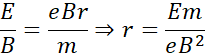 W przypadku tym siła Lorentza pełni nie tylko rolę siły dośrodkowej, ale także siły pochodzącej od pola elektrycznego selektora. Zatem porównuję siłę Lorentza dwukrotnie do wymienionych wyżej wartości i z każdej takiej operacji wyznaczam prędkość, aby ją ostatecznie porównać i wyznaczyć szukany promień.