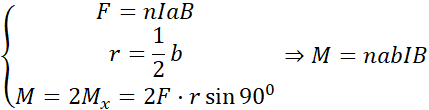 Siłę reprezentuję jako ilość zwojów pomnożona przez iloczyn natężenia, indukcji pola i długości (a), zaś moment tej siły to podwojony (bo ramka ma dwa boki) iloczyn siły i ramienia siły, który jest połową boku b.
