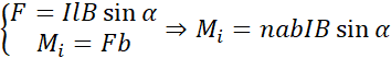 Siła elektrodynamiczna jest zależna od sinusa kąta, jaki tworzy prosta prostopadła do powierzchni ramki z kierunkiem magnetycznego pola, więc zmieni się także moment siły, który reprezentuję tym razem jako iloczyn tejże siły i długości b.