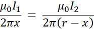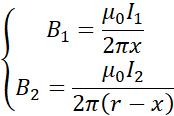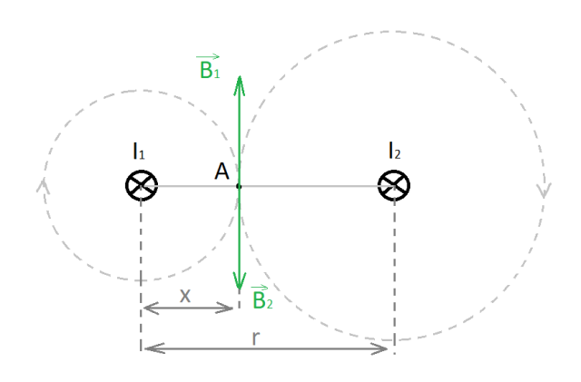 W punkcie A indukcja wypadkowa jest zerem, zatem obydwa przewodniki muszą mieć jednakowo skierowane natężenie prądu. Wartość wektora indukcji od każdego przewodnika wyrażam z definicji indukcji wokół przewodnika prostoliniowego i porównuję, wyliczając wartość natężenia prądu w przewodniku nr 2.