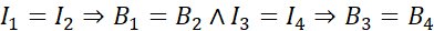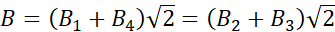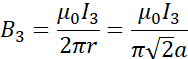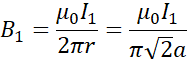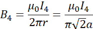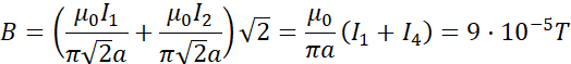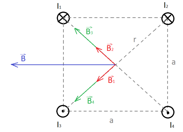 Z każdego wierzchołka kwadratu (w każdym wierzchołku znajduje się przewodnik z płynącym prądem) wyznaczam graficznie wektor indukcji, a następnie obliczam go z definicji. Po tych operacjach okazuje się, że indukcje ze wskaźnikami dolnymi 1 i 2 są sobie równe, tak samo 3 i 4 (w sensie wartości), zatem suma indukcji 1 i 4 oraz 3 i 2 tworzą wraz z przedłużeniami równoległymi kwadrat o takich bokach – wynika z tego, że wypadkowy wektor indukcji będzie przekątną tego kwadratu.