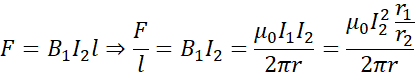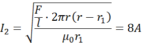 Z definicji indukcji pola przewodnika prostoliniowego z prądem zdefiniuj indukcję tworzoną w odległości r z obydwu przewodników. Wiadomo, w jakiej odległości wypadkowa indukcja jest zerem i korzystając z tejże równoważności, uzależnij natężenie pierwsze od drugiego, gdyż otrzymasz proporcję. Następnie korzystając z definicji siły elektrodynamicznej i z poprzednio określonych zależności, wylicz natężenie w przewodniku drugim i wróć do uzależnienia natężenia pierwszego od drugiego – wylicz natężenie pierwsze.