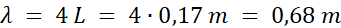 Fala stojąca powstała w słupie powietrza nad wodą, miała taką samą częstotliwość jak częstotliwość drgań kamertonu. Z rysunku, w długości słupa powietrza L, mieści się ćwierć długości fali.
